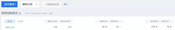 比如下圖,我們可以明顯看出“建材公司”這個關鍵詞pc端明顯要高于移動,所以我們在投放關鍵詞時就可根據用戶的的設備搜索比例來進行投放。