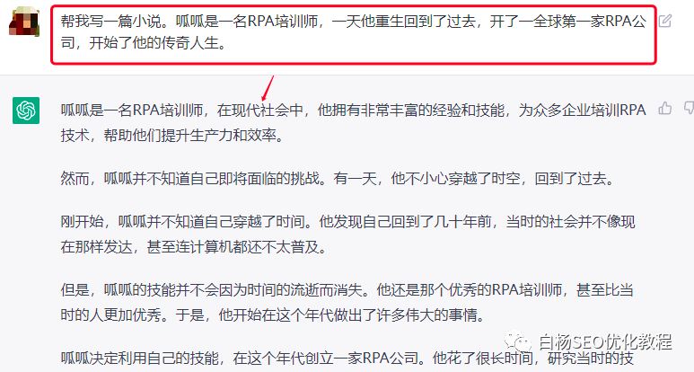 ChatGPT令人驚喜還有一個,就是它能夠進行文學創作。比如,給ChatGPT一個話題,它就可以寫小說框架。白楊流量匯會員阿愚呱呱群有個群友舉例“阿愚呱呱”為主題寫一個小說時。ChatGPT清晰地給出了故事背景、主人公、故事情節和結局哈哈哈。