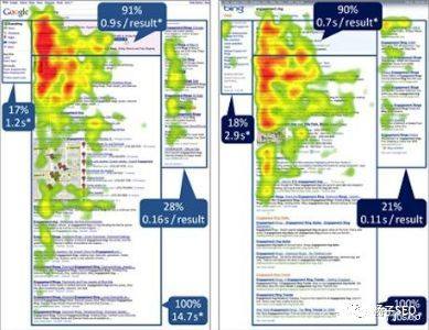 一些研究者用幾種不同的頁面做眼動儀測試,得到熱度圖,用顏色來表示瀏覽者眼光聚集的熱度,分為最熱的則為紅色、較熱的則為黃色、不熱的則為藍色和基本不關注的則為灰色。如下所示: