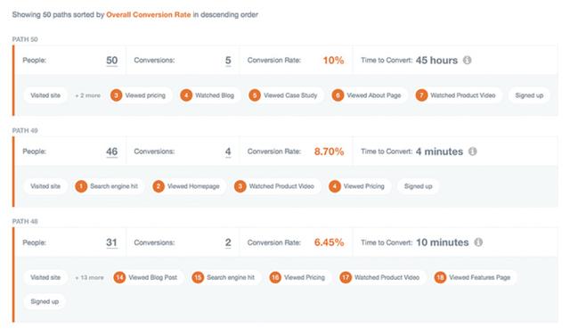 路徑報(bào)告可顯示訪問者的轉(zhuǎn)化路徑,用戶訪問頻道的方式(搜索引擎查詢,直接鍵入網(wǎng)址等),用戶采取的操作,以及每個(gè)路徑的轉(zhuǎn)化率以及轉(zhuǎn)化所花費(fèi)的時(shí)間。這些數(shù)據(jù)讓開發(fā)人員更容易修正路徑,并可能為企業(yè)帶來直接收益。
