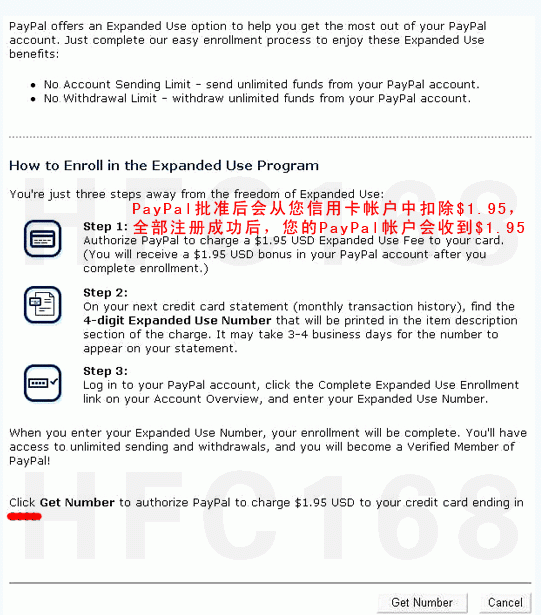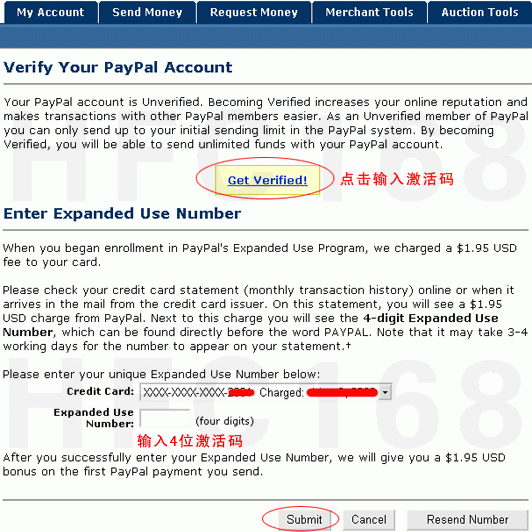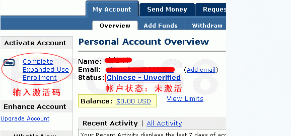 上www.paypal.com登錄后,點左邊的”Complete Expanded Use Enrollment” ,然后點”Get verified” 來輸入驗證(激活)碼并提交。