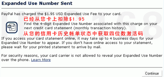 等待大約四個工作日,到你用國際信用卡開通的網(wǎng)上銀行(或致電到您的國際信用卡銀行)去獲取激活碼。此時登入網(wǎng)上銀行去查詢會發(fā)現(xiàn)扣了1.95美元,將來會返回到你的PayPal上。