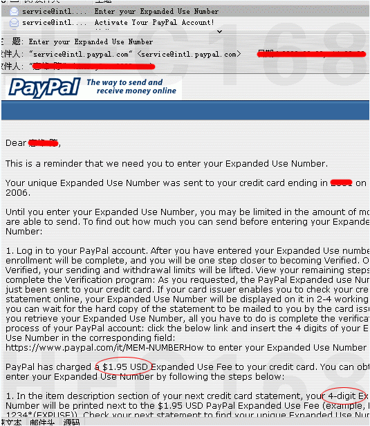 收取Paypal發(fā)來的郵件,表示已經(jīng)從您的銀行信用卡帳戶中扣除$1.95 USD