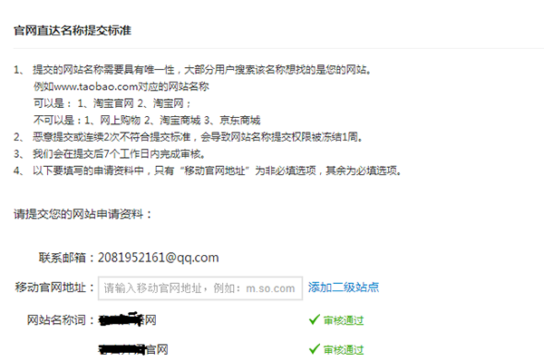 如果以上兩步完成了,點(diǎn)擊下一步就會(huì)進(jìn)入“官網(wǎng)直達(dá)名稱提交標(biāo)準(zhǔn)”頁面。提交官網(wǎng)名稱之前,你首先必須滿足以下的四點(diǎn)要求。