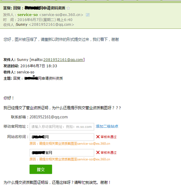 信息填好后還沒完,一定要通過郵件遞交“營(yíng)業(yè)執(zhí)照”蓋章復(fù)印件,最好還加個(gè)工信部的截圖,截圖不能太大,最好以附件的形式發(fā),發(fā)到service-so@ex.360.cn郵箱,工作人員會(huì)審核,一般效率會(huì)比較高,我的是3天就過了。你可以隨時(shí)查看“官網(wǎng)認(rèn)證”后臺(tái),如果審核通過了,會(huì)看到“審核通過”字樣。