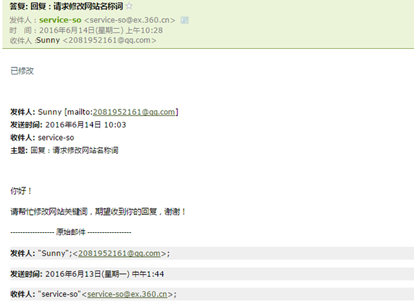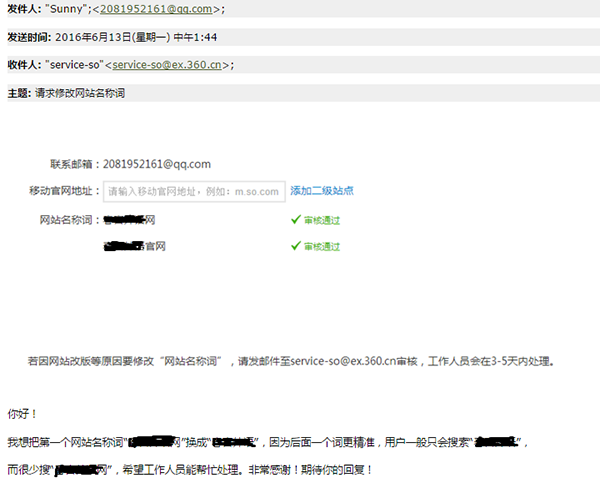 如果你開始提交的名稱詞已經(jīng)審核通過,但可能由于用戶搜索或公司發(fā)展等原因需要修改網(wǎng)站名稱詞,可以直接發(fā)郵件到指定郵箱,工作人員1-2個(gè)工作日會(huì)幫你解決的。