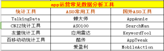 APP運營過程的各類數據都需要借助工具來分析,基于數據的分析是衡量APP運營效果的指標,同樣的,數據也被廣泛的用于制定后續的APP運營策略。因為個人偏重于ASO,所以常用的工具是蟬大師ASO工具,大家也可以根據自身的情況選擇適合自己的工具,下圖為常見的APP數據分析工具。