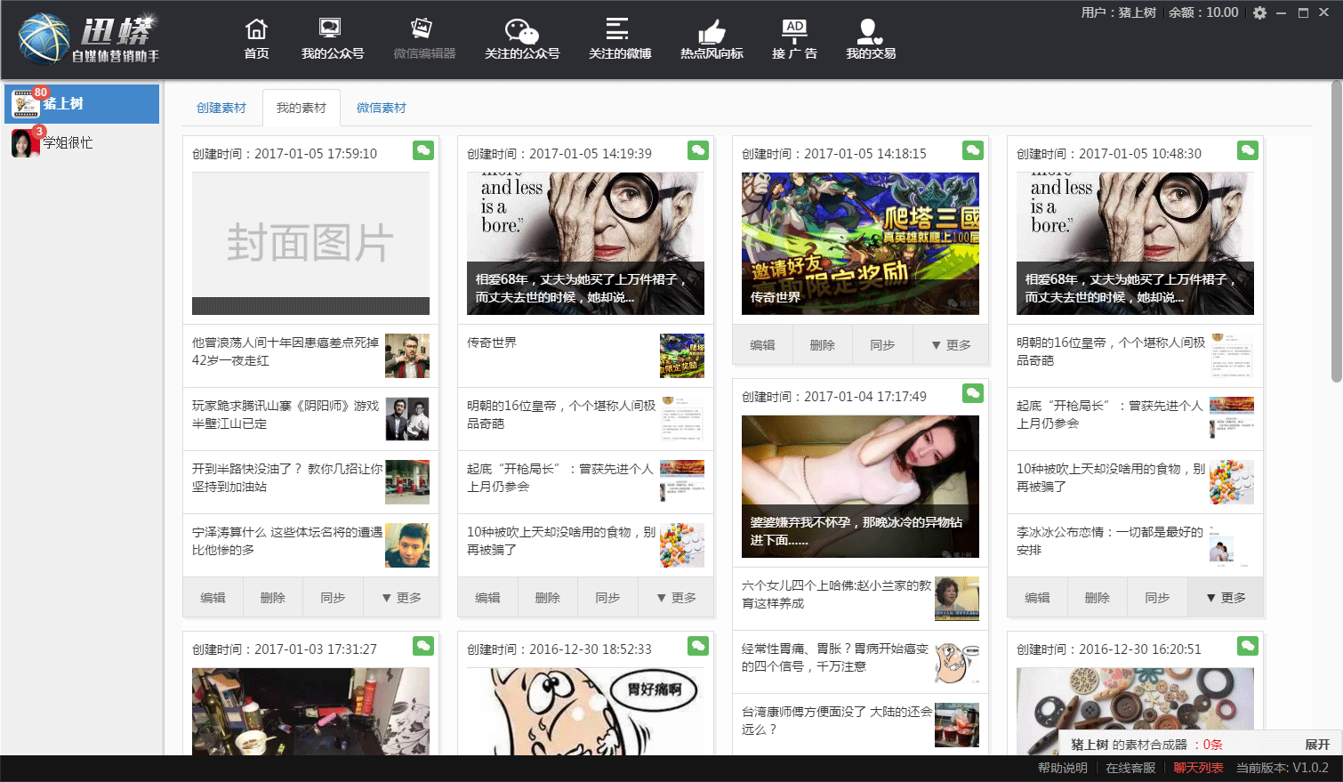 留住了粉絲才能有更多的賺錢的可能,可以推薦一款簡單好用的自媒體助手——迅蟒自媒體助手。可以幫助各位公眾號主,做好日常公眾號的運營。豐富的素材和方便的編輯器,可以幫助你更好地編輯文章,微信微博關注,實時熱點關注,可以給你每天的文章寫作提供素材。還可以同時登陸多個公眾號,同時管理多個公眾號,可以給多個公眾號同步素材。更重要的是公眾號主還可以通過軟件進行廣告交易,管理賺錢兩不耽誤。