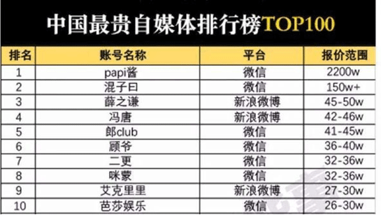 下圖是一份自媒體廣告報價表,可以看出,榜單前十名有七名都源自微信公眾號這個平臺,其中第一名是今年炙手可熱的新星PAPI醬,微信公眾號廣告的報價達到了2200萬元,在榜單上遙遙領先。