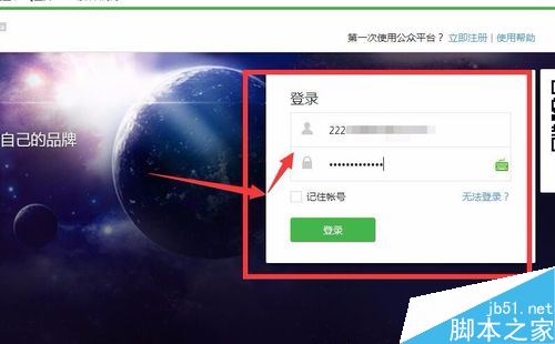 當我們進入“微信公眾平臺”我們輸入登錄名和密碼(這里已經標注出來了,登錄名有郵箱,微信號,QQ號碼)