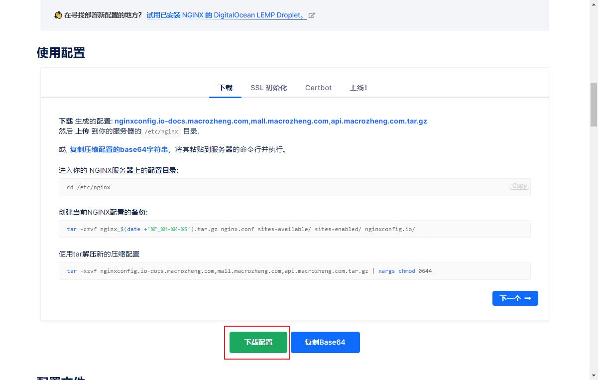 使用配置 接下來我們就可以直接下載NginxConfig給我們生成好的配置了;