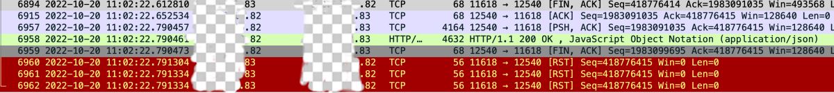 可以看到,83首先發了fin包,表示要斷開連接,之后82也回復了fin的ack包,之后82還在發送數據包,過了大概0.18秒,82才給83發了fin ack包,表示可以斷開連接了。這時候由于83早就斷開了連接,在這個中間的包,83回復了RST,我們使用的是長鏈接,83斷開連接之后,新的連接已經復用這個TCP連接了,這時候83只能回復RST。大概過程就是這樣的。