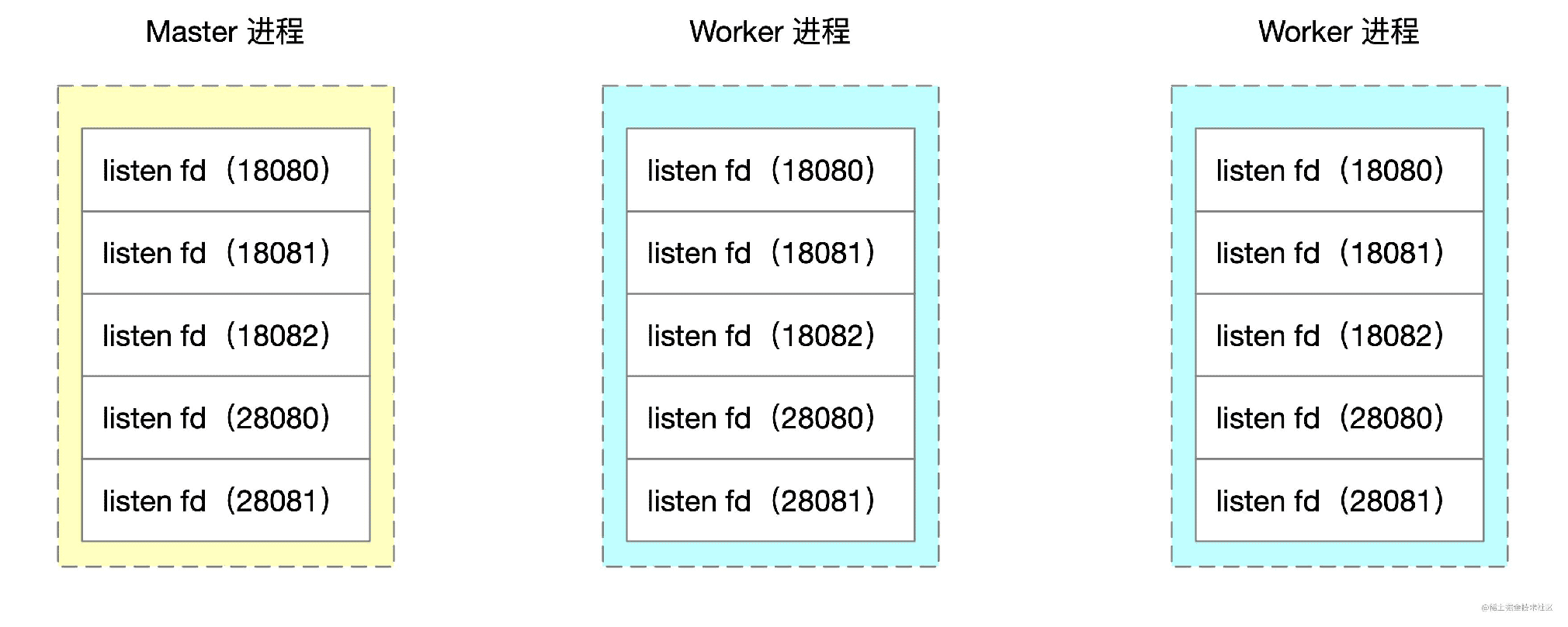 Nginx 采用多進程模式,master 進程會調用 bind、listen 監聽套接字。fork 函數創建的 worker 進程會復制這些 listen 狀態的 socket 句柄。