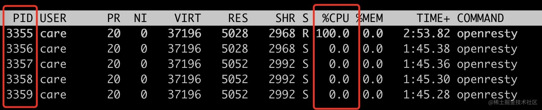 符合預期,只會跑滿 4 個普通 worker 進程(pid=3356~3359),此時 3355 的 cpu 使用率為 0。