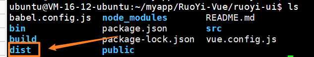 這里強烈建議將dist文件放在服務器里專門放項目的文件夾,后邊設置路徑的時候方便查找,比如我是放在了/home/ubuntu/myapp/ruoyi/ruoyi-ui的文件夾下