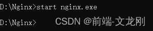 - 第三步:在當前目錄下(D:\Nginx),打開命令窗口,執行 start nginx.exe 或者直接執行 nginx.exe 即可啟動Nginx
