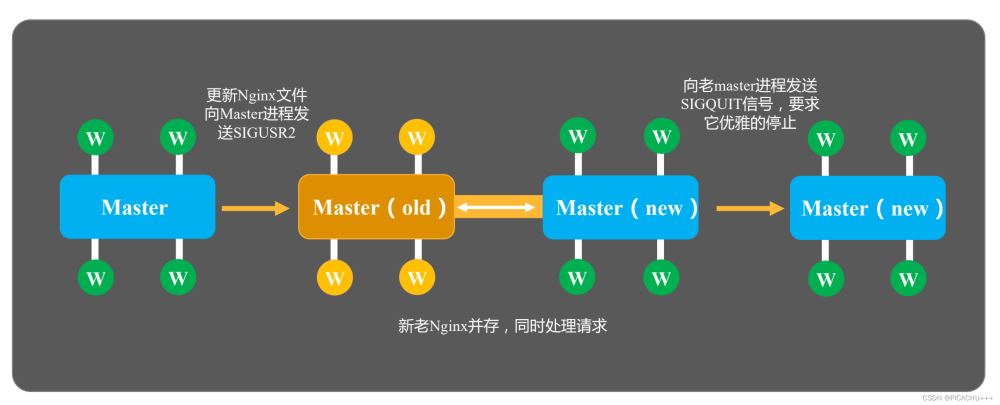 替換nginx二進制文件,向舊的master發送USR2信號,向舊的master發送WINCH,向舊的master發送QUIT
