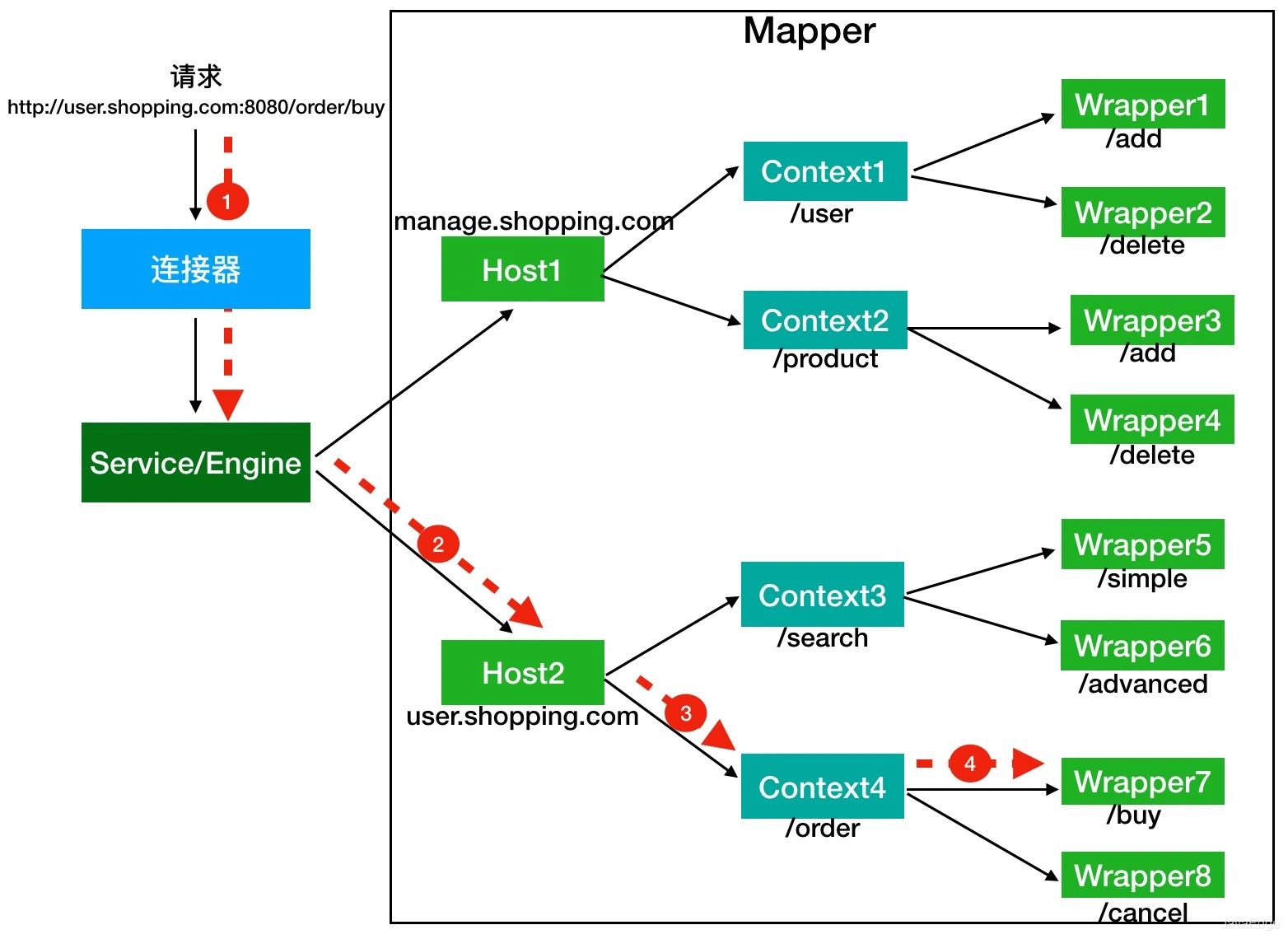 Mapper組件通過URL中的域名去查找相應的Host容器,比如user.shopping.com,因此Mapper找到Host2容器。