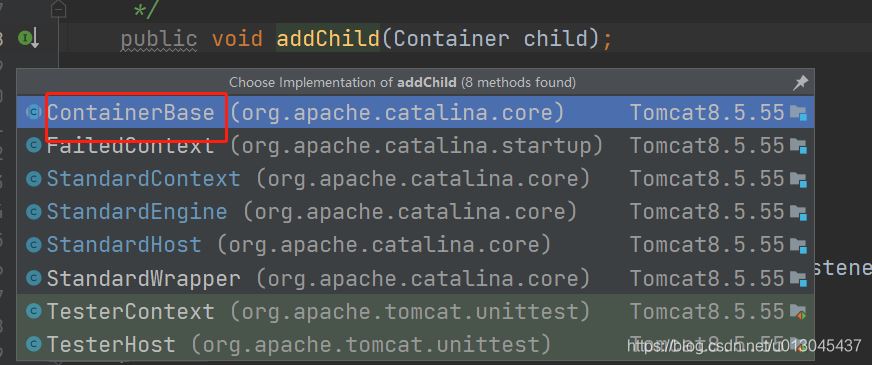 public Host getHost() {//將每一層的容器都new 出來(lái)Engine engine = getEngine();if (engine.findChildren().length > 0) { return (Host) engine.findChildren()[0];} Host host = new StandardHost();host.setName(hostname);//維護(hù)tomcat中的父子容器getEngine().addChild(host);return host; }getEngine().addChild(host); 方法選擇調(diào)用父類containerBase中的addChild方法