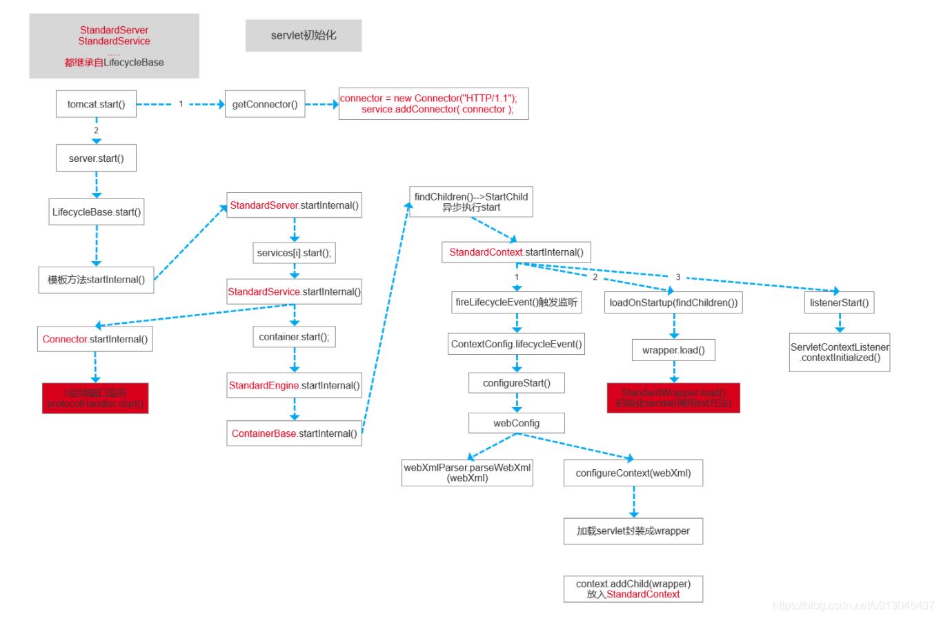 Server ---> Service --> Connector Engine addChild---> context(servlet容器) ,這就是我們從配置文件中分析出來(lái)的幾個(gè)容器,tomcat啟動(dòng)時(shí)候就是逐層啟動(dòng)容器。