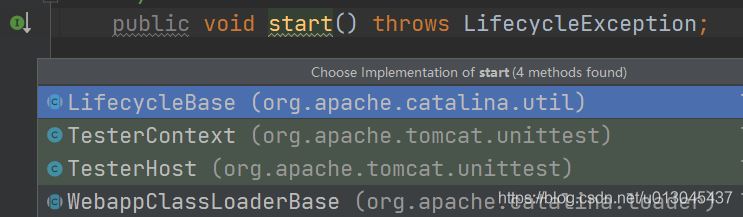 public void start() throws LifecycleException {//防止server容器沒(méi)有創(chuàng)建getServer();//獲得connector容器,并且將得到的connector容器設(shè)置到service容器中g(shù)etConnector();//這里的start的實(shí)現(xiàn)是在 LifecycleBase類中實(shí)現(xiàn)//LifecycleBase方法是一個(gè)模板方法,在tomcat啟動(dòng)流程中非常關(guān)鍵server.start(); }2) 進(jìn)入start方法