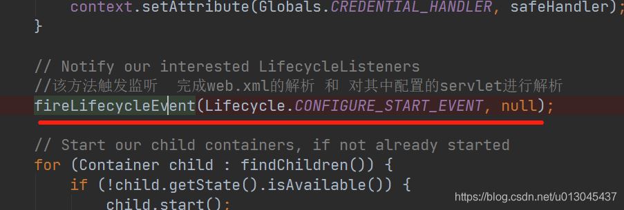 private static class StartChild implements Callable<Void> { private Container child; public StartChild(Container child) { this.child = child;} @Overridepublic Void call() throws LifecycleException { //開(kāi)始啟動(dòng)context,實(shí)際調(diào)用 StandardContext.startInternal() child.start(); return null;} }StandardContext.startInternal() 方法中的核心代碼: