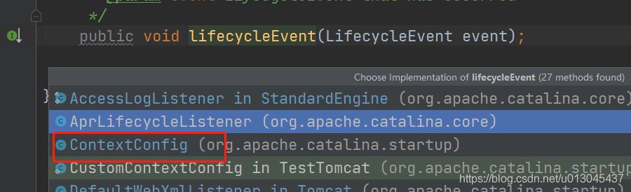 protected void fireLifecycleEvent(String type, Object data) {LifecycleEvent event = new LifecycleEvent(this, type, data);//lifecycleListeners 在addwebapp方法的第一步中,設(shè)置的監(jiān)聽(tīng)的 contextConfig對(duì)象for (LifecycleListener listener : lifecycleListeners) { //這里調(diào)用的是 contextConfig的lifecycleEvent()方法 listener.lifecycleEvent(event);} }進(jìn)入到 contextConfig中的lifecycleEvent()方法