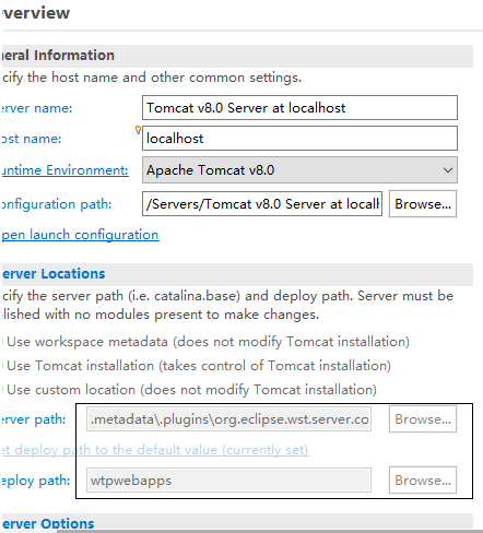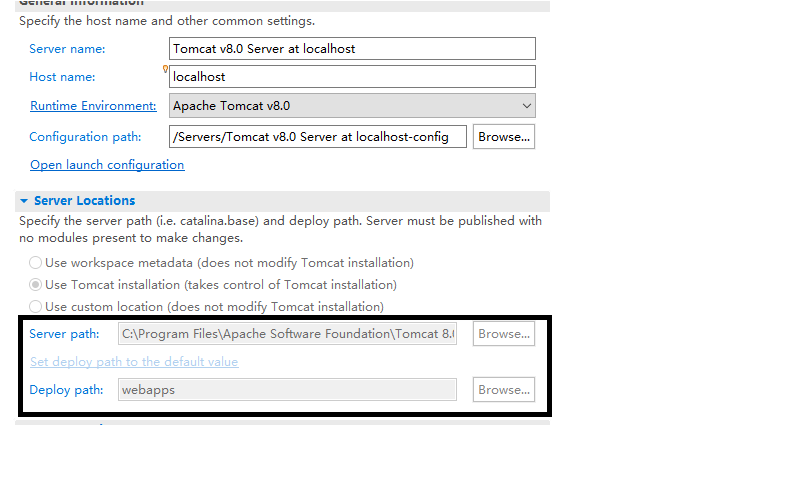 通過咨詢JAVA群中的大神,我查看了一下Tomcat文件夾中的webapps文件夾,發現里面并沒有我的項目,但是我確實是把項目部署進去了,于是我查看了一下我的Tomcat的server頁 發現里面的Tomcat路徑不對,是默認的eclipse里面的路徑,所以導致了Tomcat的部署失敗: