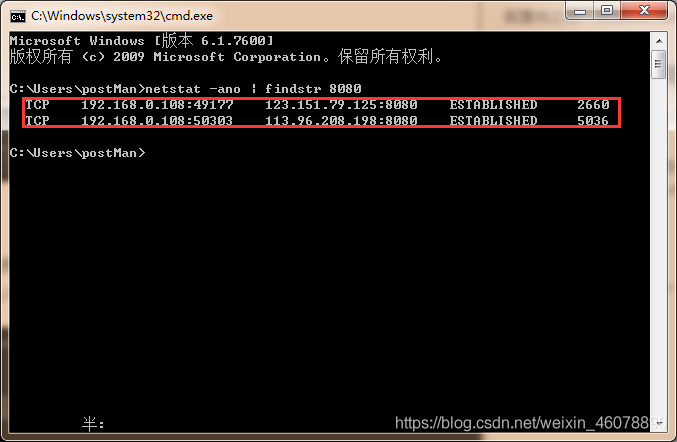 可以看到端口被占用,則可以根據PID(進程Id號)來查看占用端口的是哪個程序,在命令行中輸入