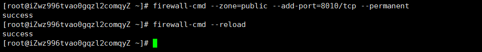 這樣就成功的將8010端口加入了public區(qū)域中,permanent參數(shù)表示永久生效,即重啟也不會(huì)失效,最后不要忘記更新防火墻規(guī)則: