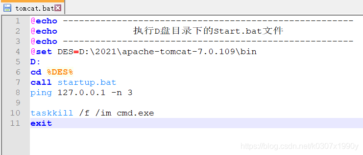 @echo ------------------------------------------------------@echo ? ? ? ? ? ? ?執(zhí)行D盤目錄下的Start.bat文件@echo ------------------------------------------------------@set DES=D:\2021\apache-tomcat-7.0.109\binD:cd %DES%call startup.batping 127.0.0.1 -n 3taskkill /f /im cmd.exeexit