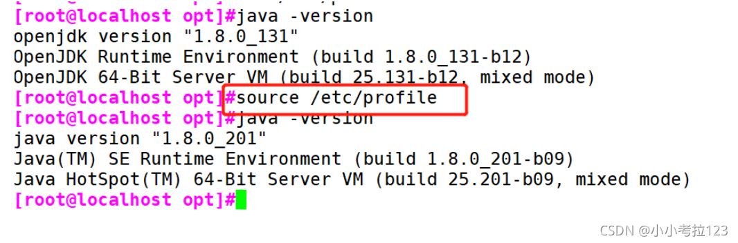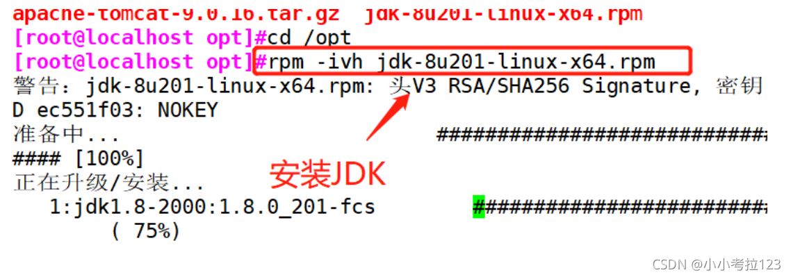 1. #關閉防火墻 systemctl stop firewalldsystemctl disable firewalldsetenforce 0 2. #將安裝 Tomcat 所需軟件包傳到/opt目錄下apache-tomcat-9.0.16.tar.gz jdk-8u201-linux-x64.rpm 3. #切換至/opt下,安裝JDKcd /optrpm -ivh jdk-8u201-linux-x64.rpm ?4. #查看java版本java -version