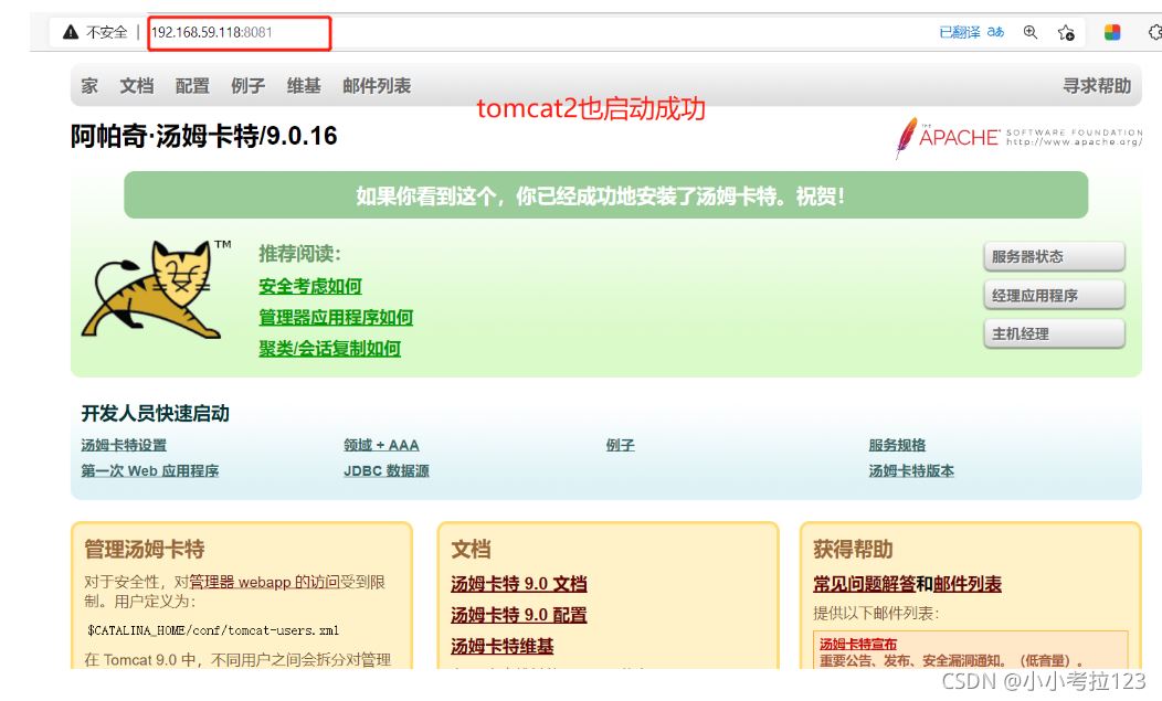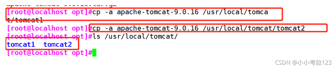 1. #切換至/opt下,解壓tomcat包cd /opttar -zxf apache-tomcat-9.0.16.tar.gz ?2. #新建文件夾/usr/local/tomcatmkdir /usr/local/tomcat 3. #將解壓后的包拷貝至/usr/local/下并重命名cp -a apache-tomcat-9.0.16 /usr/local/tomcat/tomcat1cp -a apache-tomcat-9.0.16 /usr/local/tomcat/tomcat2