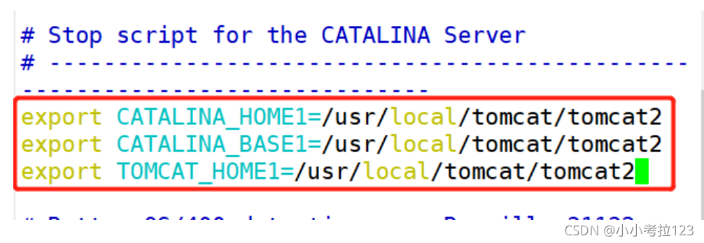 1. #修改tomcat1的/usr/local/tomcat/tomcat1/bin/startup.sh vim /usr/local/tomcat/tomcat1/bin/startup.sh ?export CATALINA_HOME1=/usr/local/tomcat/tomcat1export CATALINA_BASE1=/usr/local/tomcat/tomcat1export TOMCAT_HOME1=/usr/local/tomcat/tomcat1?2. #修改tomcat1 的/usr/local/tomcat/tomcat1/bin/shutdown.sh vim /usr/local/tomcat/tomcat1/bin/shutdown.sh ?export CATALINA_HOME1=/usr/local/tomcat/tomcat1export CATALINA_BASE1=/usr/local/tomcat/tomcat1export TOMCAT_HOME1=/usr/local/tomcat/tomcat1??3. #修改tomcat2的/usr/local/tomcat/tomcat2bin/startup.sh vim /usr/local/tomcat/tomcat2/bin/startup.sh ?export CATALINA_HOME1=/usr/local/tomcat/tomcat2export CATALINA_BASE1=/usr/local/tomcat/tomcat2export TOMCAT_HOME1=/usr/local/tomcat/tomcat2?4. #修改tomcat2的/usr/local/tomcat/tomcat2/bin/shutdown.sh vim /usr/local/tomcat/tomcat2/bin/shutdown.sh ?export CATALINA_HOME1=/usr/local/tomcat/tomcat2export CATALINA_BASE1=/usr/local/tomcat/tomcat2export TOMCAT_HOME1=/usr/local/tomcat/tomcat2?