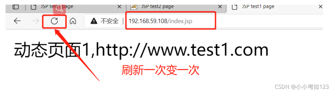 1. #切換至/usr/local/nginx/html/目錄下cd /usr/local/nginx/html/?2. #創建test文件夾,并在里面創建靜態網頁mkdir testcd testvim test.htmlthis is static test web !!?3. #拖一張圖片至test下改名為1.jpgmv 1.jfif 1.jpg?4. #配置主配置文件vim /usr/local/nginx/conf/nginx.conf?#配置負載均衡服務器列表,weight參數表示權重,權重越高,被分配到的概率越大 ?#gzip on; ? ? upstream tomcat_server { ? ? ? ? ? ? ? ? ? server 192.168.59.105:8080 weight=1; ? ? ? ? ? ? ? ? ? server 192.168.59.118:8080 weight=1; ? ? ? ? ? ? ? ? ? ? ? ? ? ? ? ? ? } ? ? ? ? ? ? ? ? ? ? ? ? ? ? ? ? ? ? ? ?#動靜分離 location ~ .*.jsp$ { ? ? ? ? proxy_pass http://tomcat_server; ? ? ? ? proxy_set_header HOST $host; ? ? ? ? proxy_set_header X-Real-IP $remote_addr; ? ? ? ? proxy_set_header X-Forwarded-For $proxy_add_x_forwarded_for; ? ? }?#靜態圖片正則 ? ? ? ? location ~* .*.(jpg|html|png|gif)$ { ? ? ? ? root /usr/local/nginx/html/test; ? ? }?? ? ? ? ? location / { ? ? ? ? ? root ? html; ? ? ? ? ? index index.html index.htm; ? ? }???5. ?#重啟nginx并測試http://192.168.59.108/1.jpghttp://192.168.59.108/test.html切換至cd /usr/local/nginx/html/目錄下