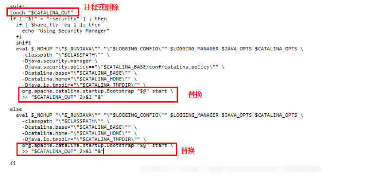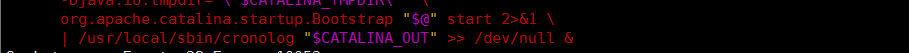 修改為: shift # touch "$CATALINA_OUT" if [ "$1" = "-security" ] ; then if [ $have_tty -eq 1 ]; then echo "Using Security Manager" fi shift eval $_NOHUP "\"$_RUNJAVA\"" "\"$LOGGING_CONFIG\"" $LOGGING_MANAGER $JAVA_OPTS $CATALINA_OPTS \ -classpath "\"$CLASSPATH\"" \ -Djava.security.manager \ -Djava.security.policy=="\"$CATALINA_BASE/conf/catalina.policy\"" \ -Dcatalina.base="\"$CATALINA_BASE\"" \ -Dcatalina.home="\"$CATALINA_HOME\"" \ -Djava.io.tmpdir="\"$CATALINA_TMPDIR\"" \ org.apache.catalina.startup.Bootstrap "$@" start 2>&1\ | /usr/local/sbin/cronolog "$CATALINA_BASE"/logs/catalina.%Y-%m-%d.out >> /dev/null & else fi