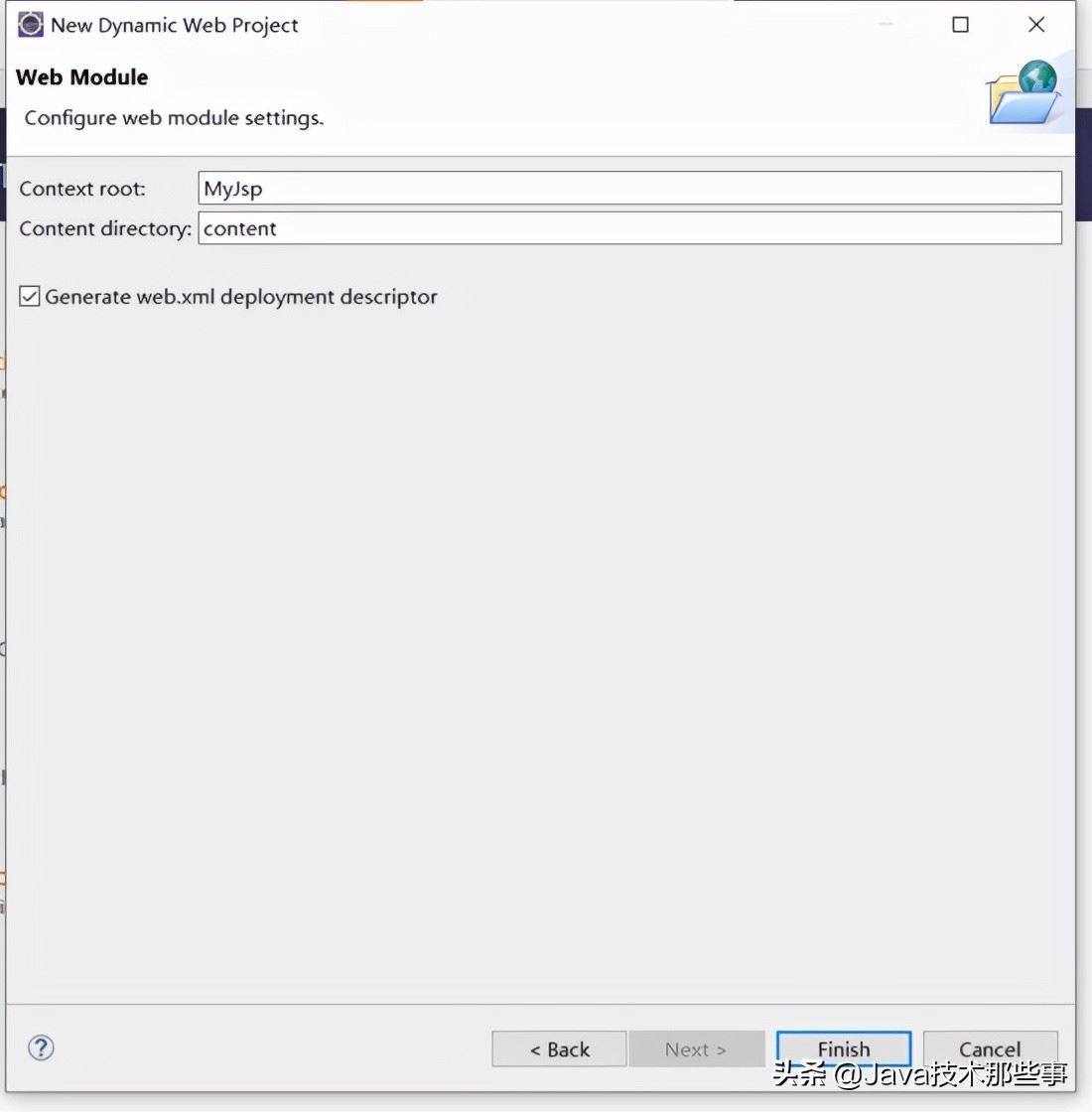 7.之后next,next,然后勾選創(chuàng)建web.xml文件,此處我把content directory改為content,這樣創(chuàng)建的目錄會(huì)有所不同,不過對(duì)Tomcat配置沒有影響。弄完直接finish即可。