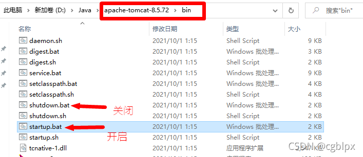 D:\Java\apache-tomcat-8.5.72\bin: 存放tomcat服務器中可執行文件的目錄