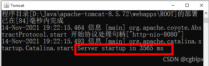 D:\Java\apache-tomcat-8.5.72\logs: 存放tomcat服務器運行時產生的日志文件的目錄,記錄每次啟動關閉的一些信息