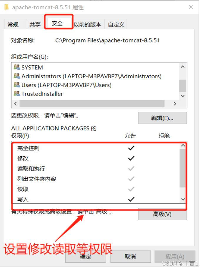 找到tomcat目錄,右鍵“屬性—>安全—>編輯”,找到Users,將“完全控制”選項“允許”打鉤,應(yīng)用。