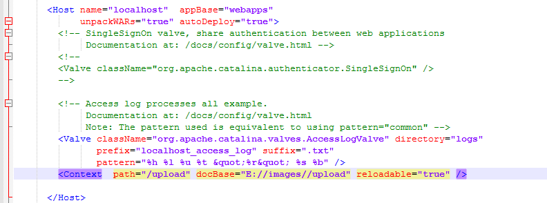 2.在該文件Host節點下加入:<Context path="/upload" docBase="E://images//upload" reloadable="true" />