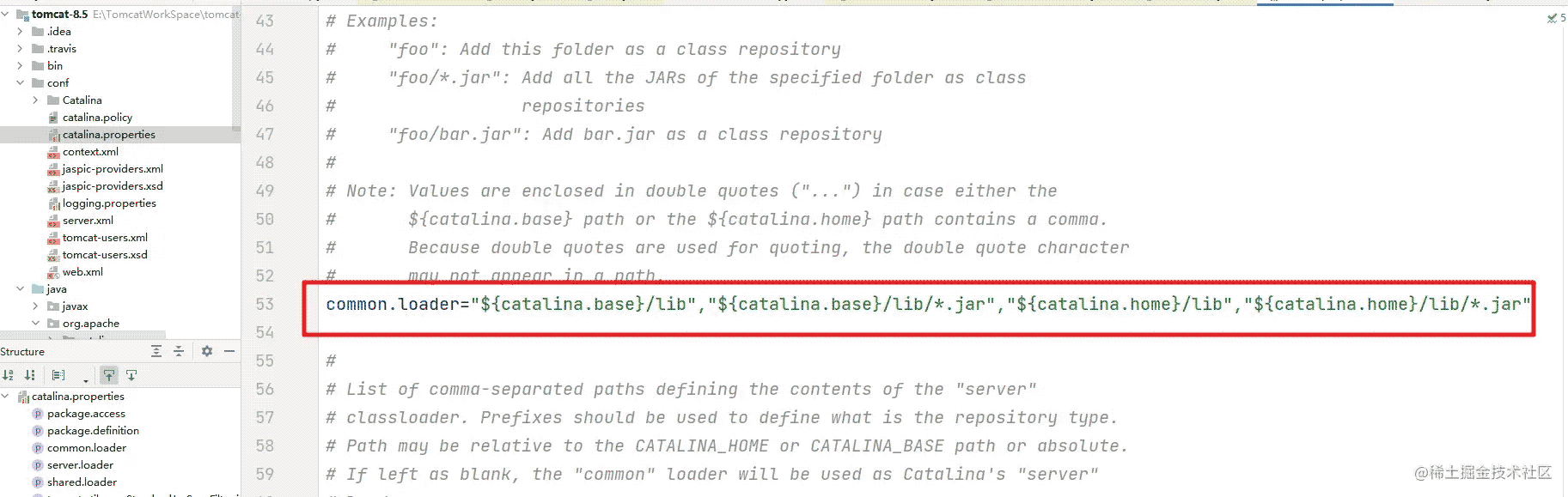 以應用類加載器為父類,是tomcat頂層的公用類加載器,其路徑由conf/catalina.properties中的common.loader指定,默認指向${catalina.base}/lib下的包。