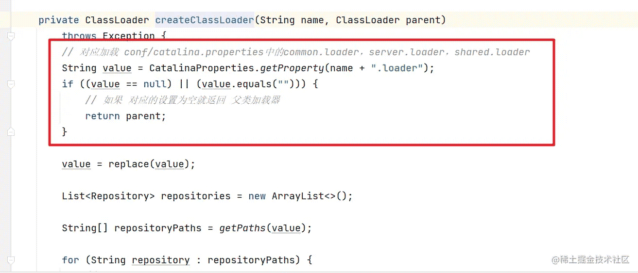 private void initClassLoaders() {try { // 創建 commonLoader catalinaLoader sharedLoader commonLoader = createClassLoader("common", null); if (commonLoader == null) {// no config file, default to this loader - we might be in a "single" env.commonLoader = this.getClass().getClassLoader(); } // 默認情況下 server.loader 和 shared.loader 都為空則會返回 commonLoader 類加載器 catalinaLoader = createClassLoader("server", commonLoader); sharedLoader = createClassLoader("shared", commonLoader);} catch (Throwable t) { handleThrowable(t); log.error("Class loader creation threw exception", t); System.exit(1);} }我們可以看到在initClassLoaders()方法中完成了CommonClassLoader, CatalinaClassLoader,和SharedClassLoader的創建,而且進入到createClassLoader方法中。