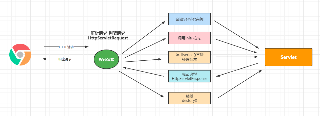 對應(yīng)的服務(wù)器容器會接收到對應(yīng)的Http請求,然后解析該請求,然后創(chuàng)建對應(yīng)的Servlet實例,調(diào)用對應(yīng)init方法來完成初始化,把請求的相關(guān)信息封裝為HttpServletRequest對象來調(diào)用Servlet的service方法來處理請求,然后通過HttpServletResponse封裝響應(yīng)的信息交給容器,響應(yīng)給客戶端。
