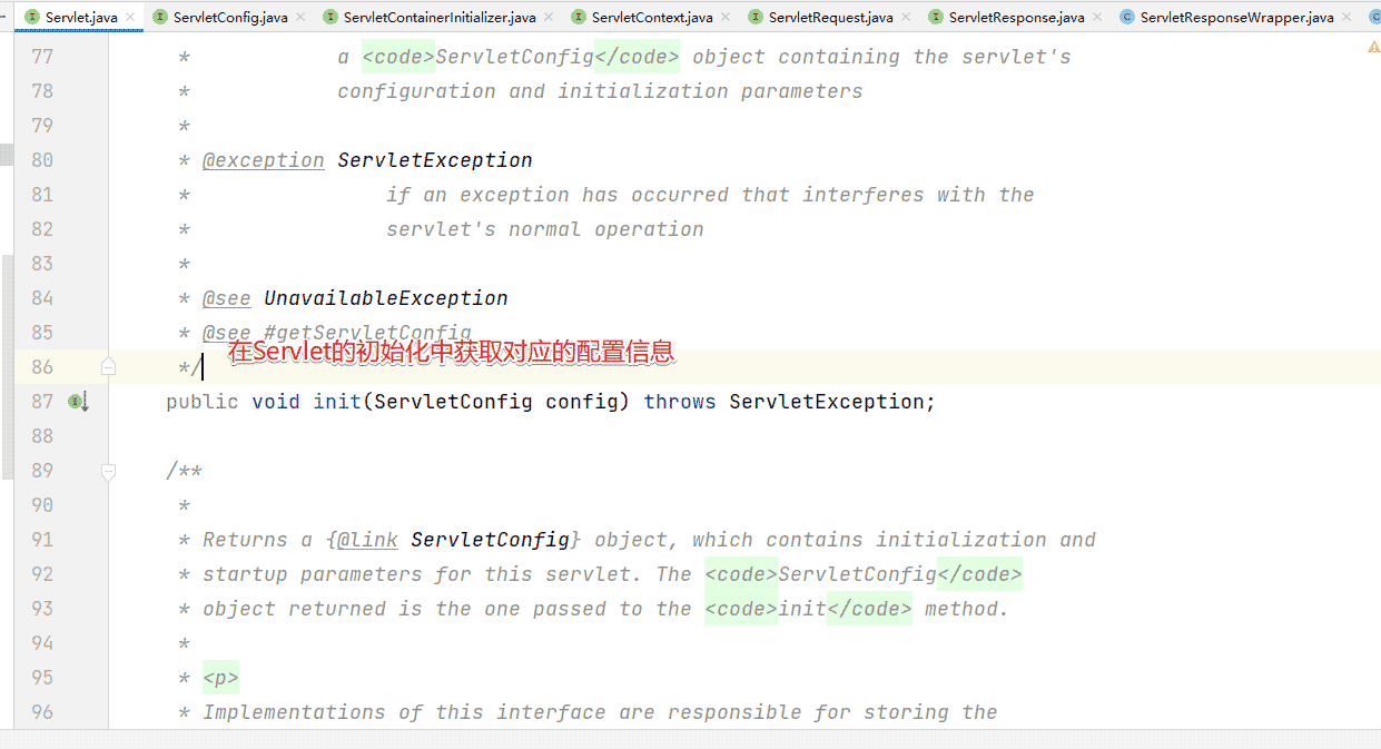 容器在初始化servlet時,為該servlet創(chuàng)建一個servletConfig對象,并將這個對象通過init()方法來傳遞并保存在此Servlet對象中。核心作用: