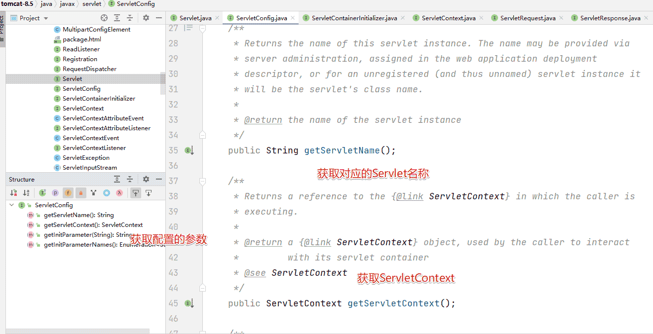 在實際的Servlet開發(fā)中,我們會實現(xiàn)HttpServlet接口,在該接口中會實現(xiàn)GenericServlet,而在GenericServlet會實現(xiàn)ServiceConfig接口,從而可以獲取ServletContext容器對象