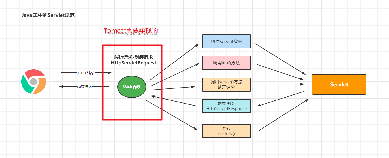 通過上面Servlet規(guī)范的介紹,其實我們發(fā)下我們要實現(xiàn)Servlet規(guī)范的話,很重要的就得提供一個服務(wù)容器來獲取請求,解析封裝數(shù)據(jù),并調(diào)用Servlet實例相關(guān)的方法。也就是如下圖中的部分