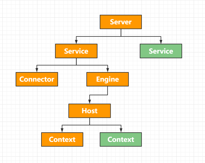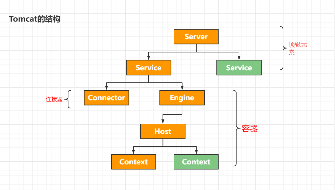 <Server> <Service><Connector /><Connector /><Engine> <Host><Context /><!-- 現(xiàn)在常常使用自動部署,不推薦配置Context元素,Context小節(jié)有詳細說明 --> </Host></Engine> </Service></Server>