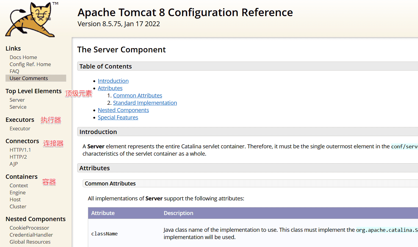 - Server元素在最頂層,代表整個Tomcat容器;一個Server元素中可以有一個或多個Service元素