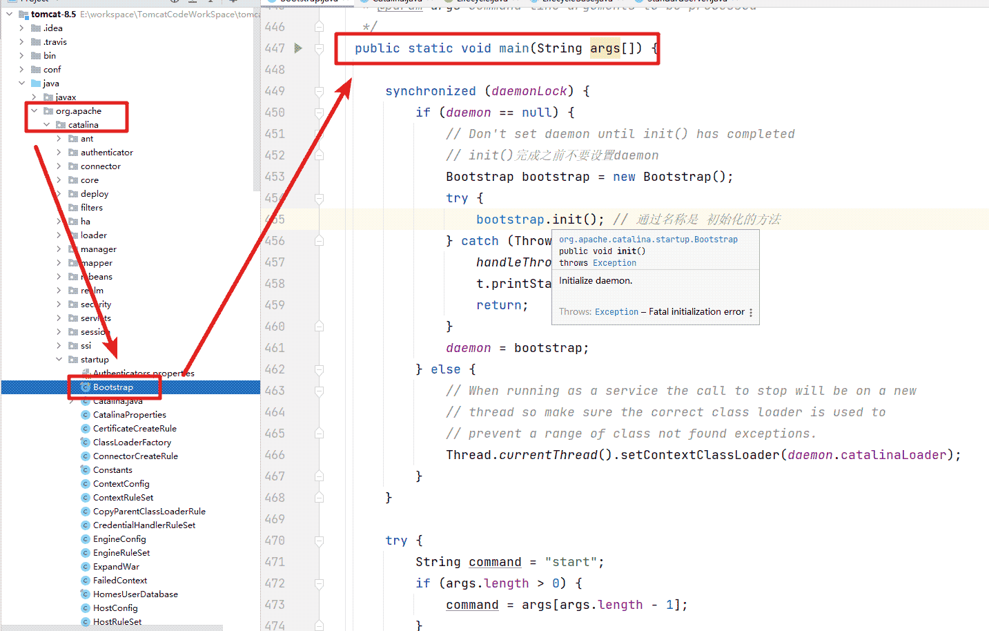 你可以通過腳本來啟動Tomcat服務(startup.bat),但如果你看過腳本的命令,你會發現最終調用的還是Bootstrap中的main方法,所以我們需要從main方法來開始